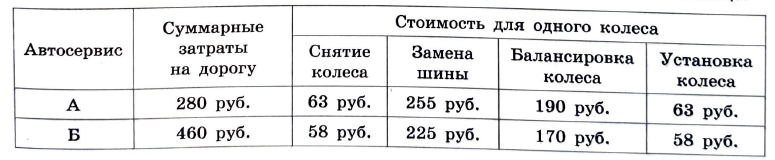 Задание 5: Сергей планирует заменить зимнюю резину на летнюю на своём автомобиле. Для каждого из четырёх колёс последовательно выполняются четыре операции: снятие колеса, замена шины, балансировка колеса и установка колеса. Он выбирает между автосервисами А и Б. Затраты на дорогу и стоимость операций даны в таблице.