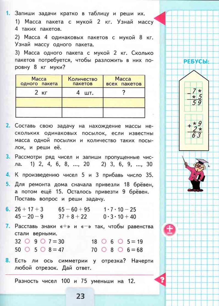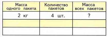 2) Масса 4 одинаковых пакетов с мукой 8 кг. Узнай массу одного пакета.