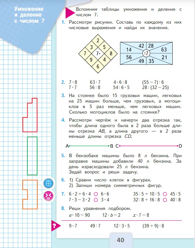 2) 40 : 5 = 8 шт – мотоциклов было на стоянке.