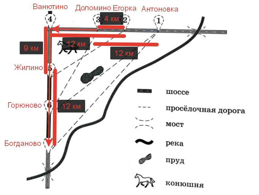 По шоссе Таня с дедушкой едут со скоростью 60 км/ч, а по просёлочным дорогам – со скоростью 25 км/ч. Расстояние от Антоновки до Доломино равно 12 км, от Доломино до Егорки – 4 км, от Егорки до Ванютино – 12 км, от Горюново до Ванютино – 15 км, от Ванютино до Жилино – 9 км, а от Жилино до Богданово – 12 км.