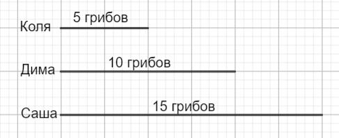 Ответ: Коля собрал 5 грибов. Дима собрал 10 грибов, Саша собрал 15 грибов.