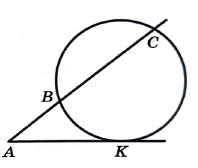 Теорема о секущей и касательной гласит: если из точки, лежащей вне окружности, проведены касательная и секущая, то квадрат длины касательной равен произведению секущей на ее внешнюю часть. В нашем случае секущая AC=AB+BC=3+24=27, касательная AK и внешняя часть секущей AB.