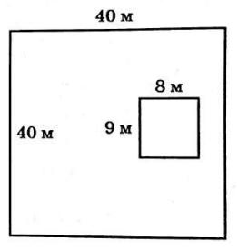 Дачный участок имеет форму квадрата, сторона которого равна 40 м. Дом, расположенный на участке, имеет на плане форму прямоугольника, стороны которого равны 9 м и 8 м. Найдите площадь оставшейся части участка, не занятой домом. Ответ дайте в квадратных метрах.