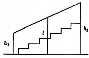 Перила лестницы дачного дома крепятся на трех вертикальных столбах. Найдите высоту h_1 короткого столба, если высота l среднего столба равна 2,6 м, а высота h_2 длинного столба равна 3,1. Ответ дайте в метрах.