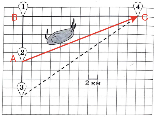По шоссе Гриша с дедушкой едут со скоростью 15 км/ч, а по лесной дорожке и тропинке – со скоростью 12 км/ч. На плане изображено взаимное расположение населённых пунктов, длина стороны каждой клетки равна 2 км.